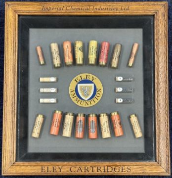 Eley Ammunition shotgun cartridge display board decorated with various Eley shotgun cartridges and shot, in oak 'Imperial Chemical Industries Ltd Eley Cartridges' frame, 42.5x40cm.
