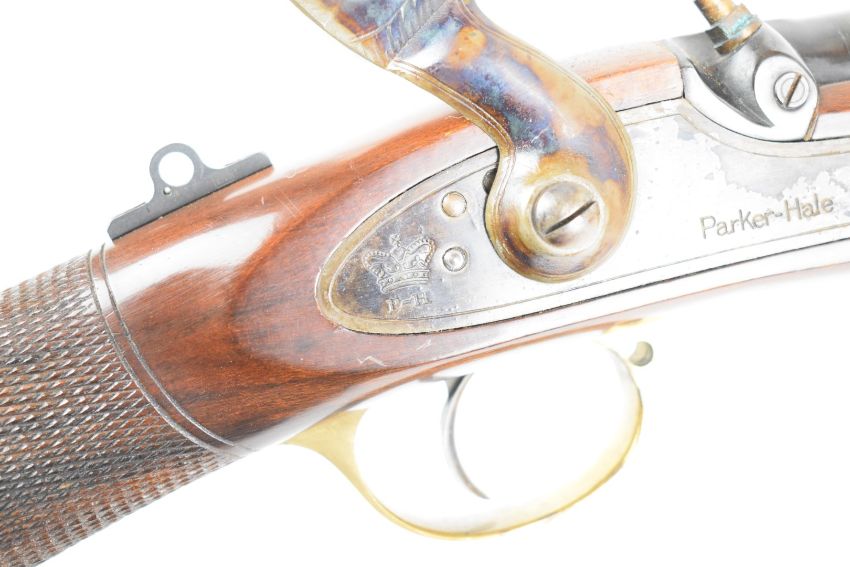 Parker-Hale Enfield pattern 3-band .451 muzzle loading percussion hammer action rifle with crown over 'P-H' cypher and 'Parker-Hale' to the lock, adjustable pop-up ladder sights, brass trigger guard and butt plate, chequered grip, sling suspension mounts, steel ram-rod and 36 inch rifled barrel, overall length 132.5cm, serial number 548. PLEASE NOTE THAT A VALID RELEVANT FIRARMS CERTIFICATE IS REQUIRED TO VIEW OR PURCHASE THIS LOT AND FOR ALL SHOTGUNS OR RIFLES PLEASE ENSURE YOU HAVE THE RELEVANT CERTIFICATE BEFORE BIDDING.