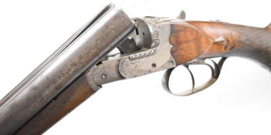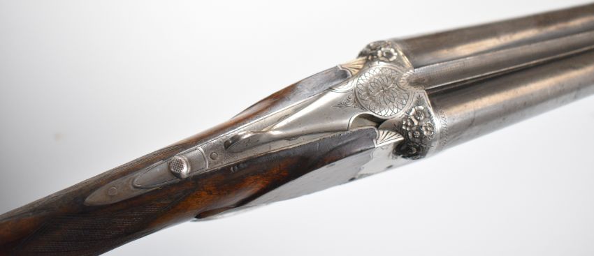 Continental 16 bore side by side shotgun with engraved locks, underside, trigger guard, thumb lever and fences, chequered semi-pistol grip and forend, carved teardrop to the stock, sling mounts, double trigger and named 26.75 inch barrels, overall length 109cm, length of pull 36cm, serial number 952. PLEASE NOTE THAT A VALID RELEVANT FIREARMS/SHOTGUN CERTIFICATE IS REQUIRED TO HANDLE/PURCHASE THIS ITEM.