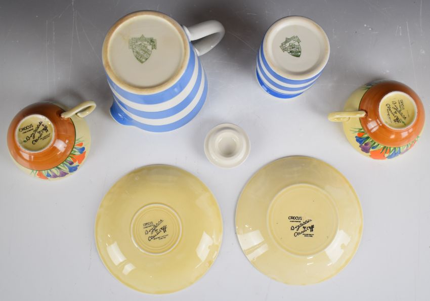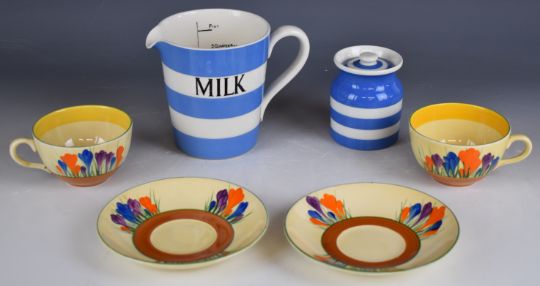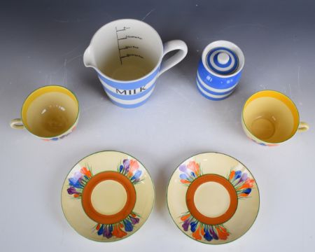 Clarice Cliff Bizarre for Wilkinson and Newport Potteries, two cups and saucers decorated in the Crocus pattern, T. G Green milk jug etc, tallest 15cm