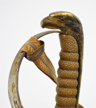 Royal Air Force officer's sword retailed by Burberry London with fish skin and wire covered grip, pierced guard with RAF cypher and initials J.A.C - B.J.M.N, 82cm decorated blade, knott and scabbard. PLEASE NOTE: WE ARE NOT ABLE TO OFFER OUR USUAL POSTAGE SERVICE FOR THIS LOT