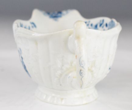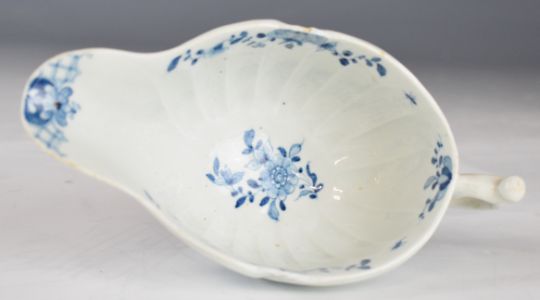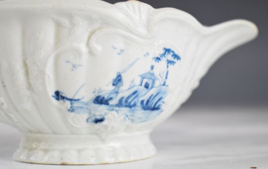 First period Worcester porcelain blue and white relief moulded pedestal sauce boat decorated in the fisherman pattern, H7 x L18.5cm