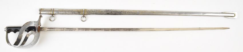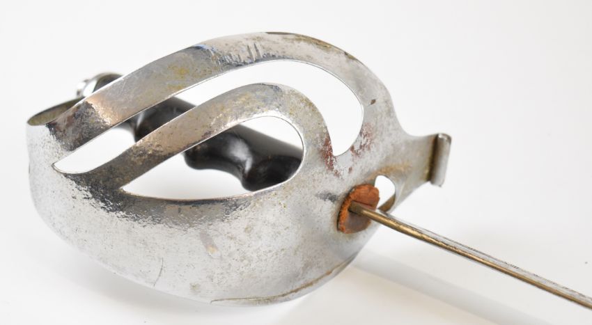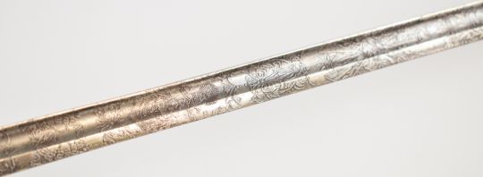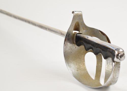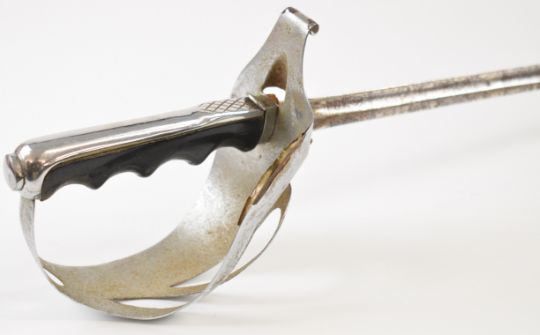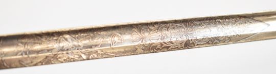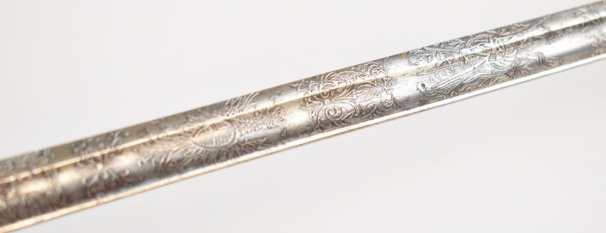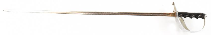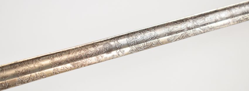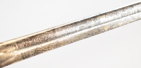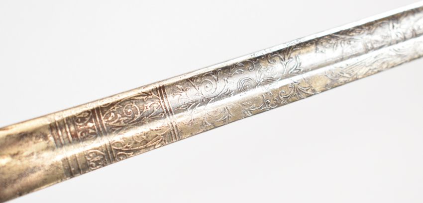 Italian Cavalry officer's dress sword with wooden grip, decorated 79cm blade, possibly with Royal Savoy Coat of Arms to one side and scabbard. PLEASE NOTE: WE ARE NOT ABLE TO OFFER OUR USUAL POSTAGE SERVICE FOR THIS LOT