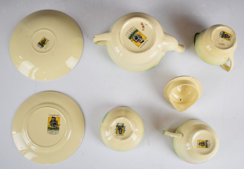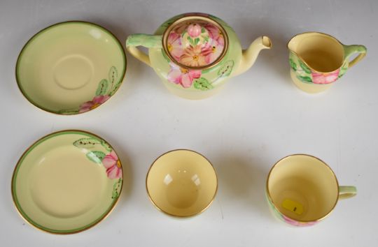 Grays Pottery Art Deco tea for one set decorated with pink flowers, A3650, tallest 12cm
