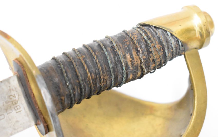 US Navy 1860 pattern cutlass with wire bound leather covered grip, brass guard, ricasso marked U.S N 1862 and Ames Mass., 66cm single edged blade and scabbard with belt attachment. PLEASE NOTE: WE ARE NOT ABLE TO OFFER OUR USUAL POSTAGE SERVICE FOR THIS LOT
