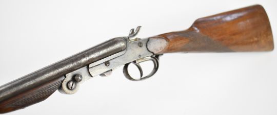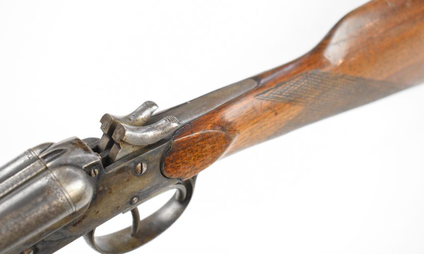 Belgian .410 side by side hammer action folding poacher's shotgun with chequered grip and forend, double trigger and 28 inch barrels, overall length 111cm, length of pull 37cm, serial number 1042. PLEASE NOTE THAT A VALID RELEVANT SHOTGUN CERTIFICATE IS REQUIRED TO VIEW OR PURCHASE THIS LOT AND FOR ALL SHOTGUNS OR RIFLES PLEASE ENSURE YOU HAVE THE RELEVANT CERTIFICATE BEFORE BIDDING.