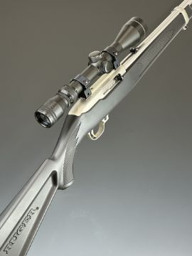 Ruger Model 10/22 .22 semi-automatic rifle with textured semi-pistol grip and forend, composite stock, Tasco Silver Antler 3-9x40 WA scope, rotary magazine, sound moderator and 255 inch barrel, overall length 109.5cm, serial number 248-80022. PLEASE NOTE THAT A VALID RELEVANT FIREARMS CERTIFICATE IS REQUIRED TO HANDLE/PURCHASE THIS ITEM.