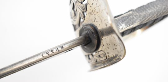 British 1897 pattern Infantry officer's sword with GVR cypher to guard, 82cm plain blade and scabbard. PLEASE NOTE: WE ARE NOT ABLE TO OFFER OUR USUAL POSTAGE SERVICE FOR THIS LOT