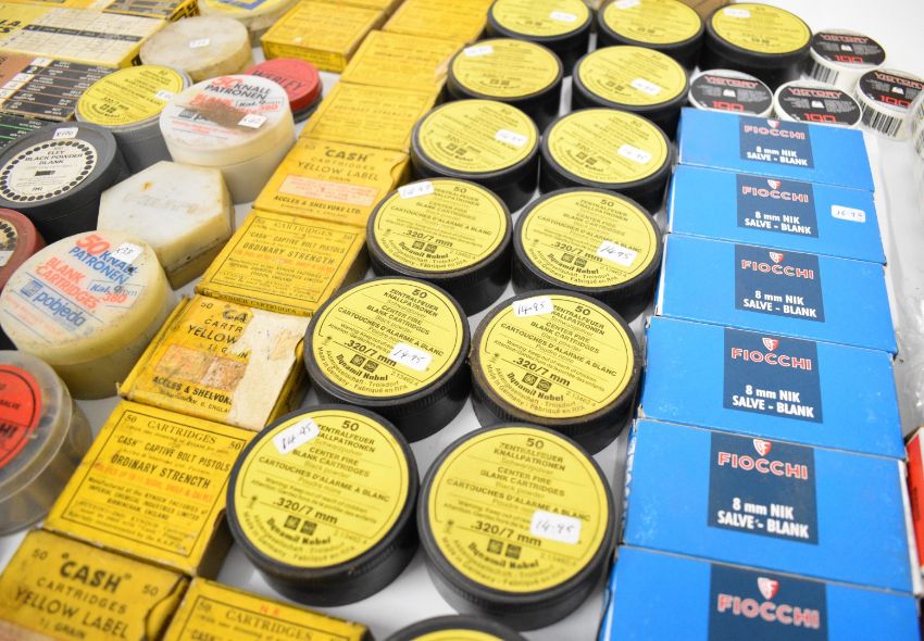 A large collection of blank cartridges including Cash Yellow Label captive bolt, .30 Rifle Grenade Launcher, Fiocchi 8mm, .22 dummy launcher, .320, .32 Smith & Wesson, 9mm etc, most in original boxes. We are not able to offer our usual postage service for this lot