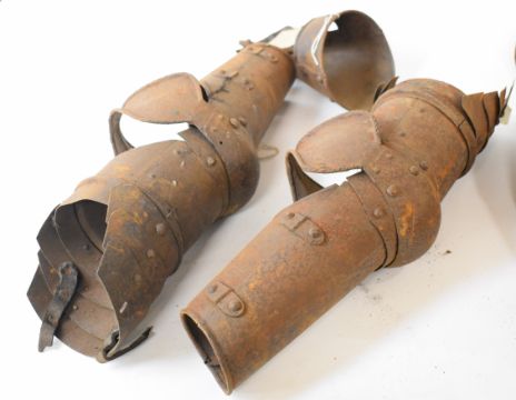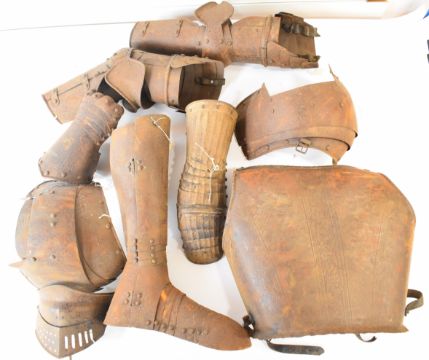 Nine pieces of Medieval style armour including breast plate, leg and foot vizor, arm, elbow and shoulder protection