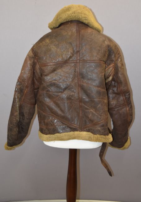 Royal Air Force WW2 Irvine pattern brown leather sheepskin lined flying jacket with zip pull to front marked Lightning and cuff zip pulls marked AM under crown, front zip missing some teeth