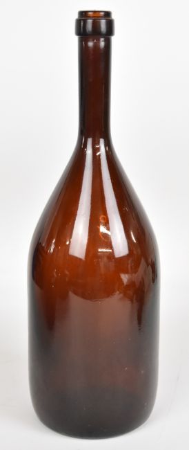 19thC large brown glass wine / champagne or possibly apothecary bottle with 'VMA' and beehive or ladder motif to base, H48cm