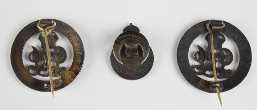 Two British WW1 silver War Badges numbered B200656 and 447127, together with a Royal Army Reserve hallmarked silver lapel badge