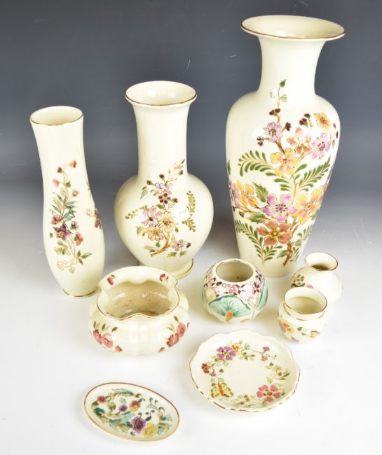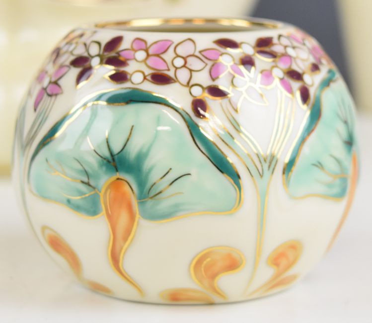 Collection of Zsolnay Pecs vases and pin dishes, tallest 34cm