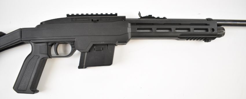 Crosman 1077 TAC repeater .177 CO2  air rifle with textured pistol grip, composite skeleton stock, adjustable sights and scope rail, serial number 723B38068, in original box. PLEASE NOTE: IF YOU REQUIRE POSTAGE, THIS LOT CAN ONLY BE SENT TO AN RFD
