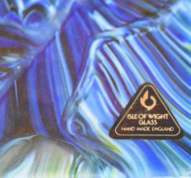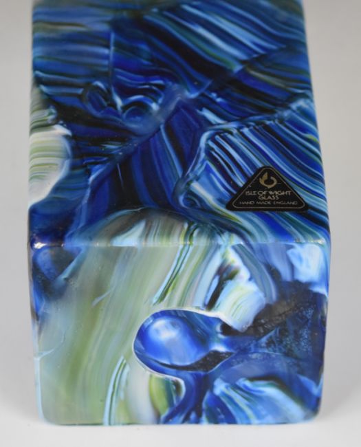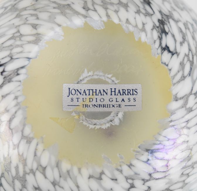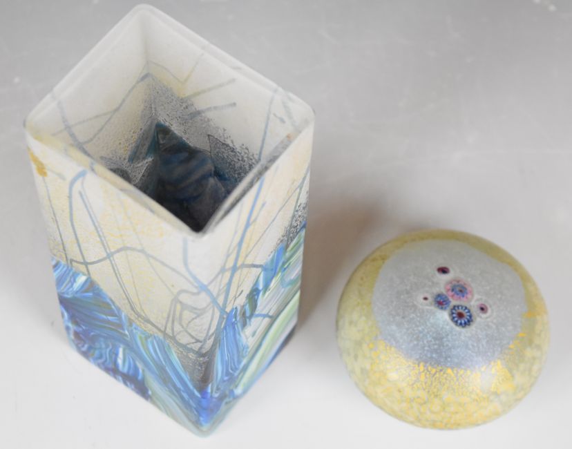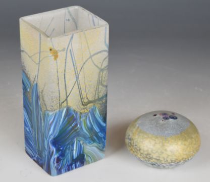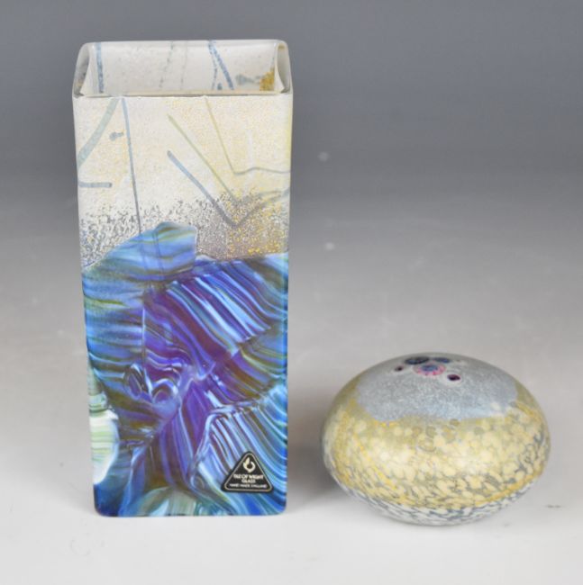 Isle of Wight iridescent glass vase and a signed Jonathan Harris paperweight