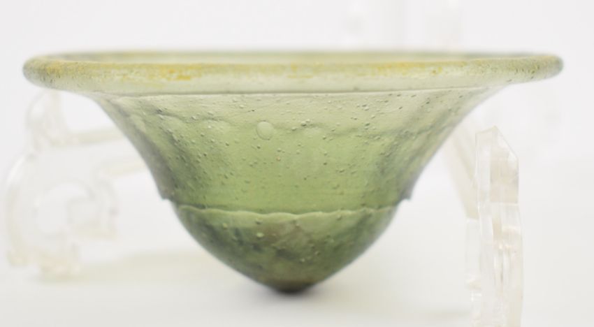 Anglo Saxon or Merovingian glass palm cup with folded rim, circa 7thC AD, 8.7cm in diameter.