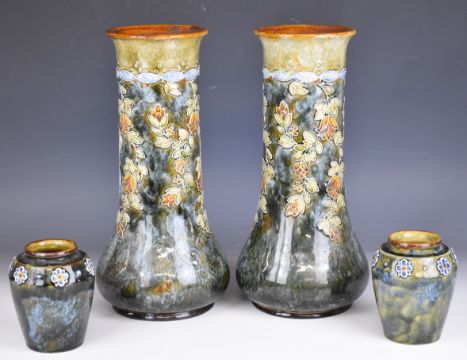 Pair of Royal Doulton art pottery pedestal vases and a pair of smaller examples, tallest 33cm