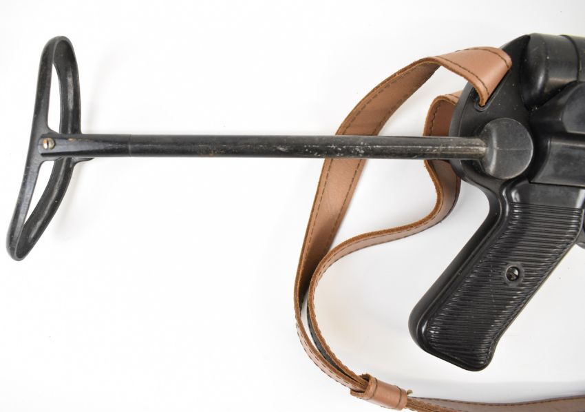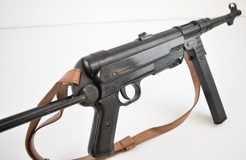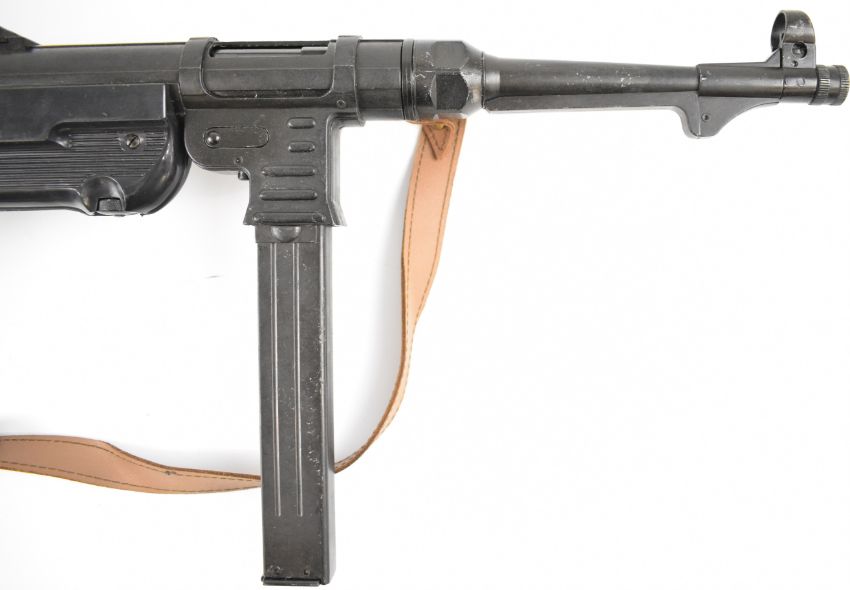 Denix or similar relica MP40 sub machine gun with textured pistol grip, folding stock, extended magazine and 13 inch barrel, overall length 83cm.