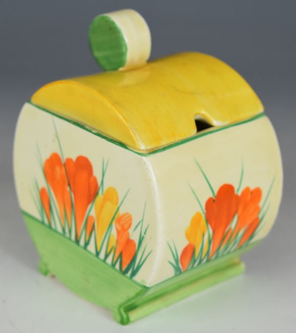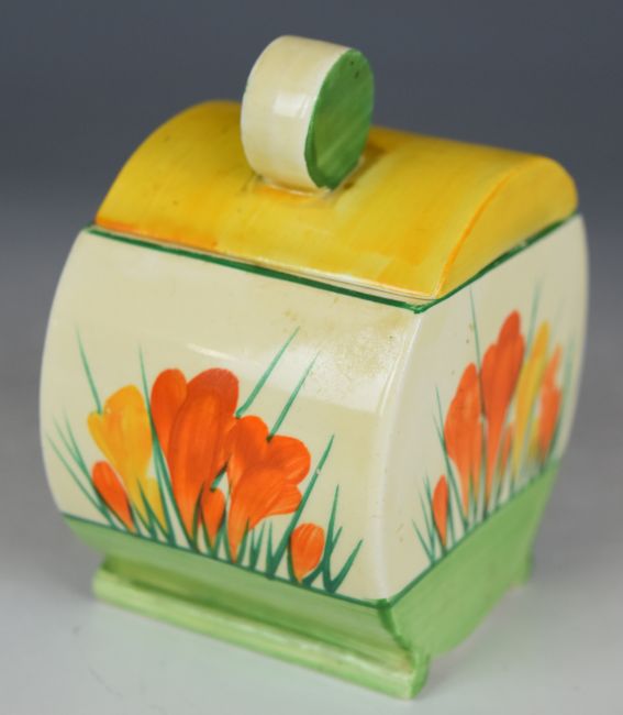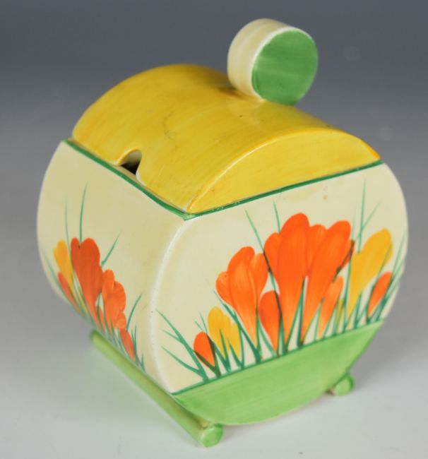 Clarice Cliff Bizarre for Wilkinson Pottery Bonjour shape covered preserve pot decorated in the Crocus pattern, H10.5cm