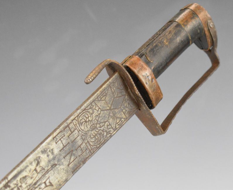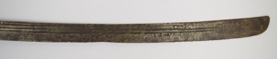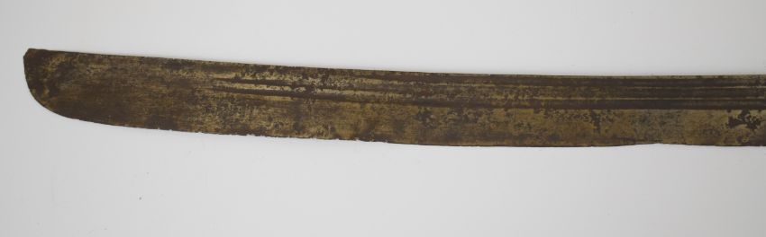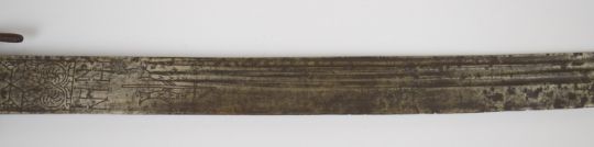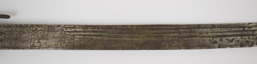 Saudi style sword with wooden grip, metal and copper hilt and 77cm part decorated fullered wide blade. PLEASE NOTE: WE ARE NOT ABLE TO OFFER OUR USUAL POSTAGE SERVICE FOR THIS LOT