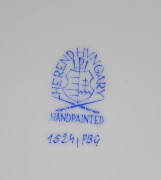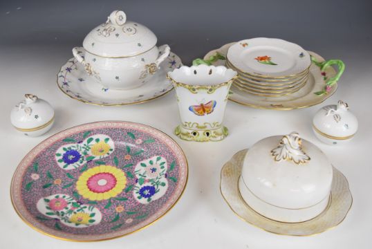 Collection of Herend porcelain, various patterns including botanical enamelled cabinet plate, twin handled cake plate with six side plates, covered tureen etc., tallest 15cm, largest diameter 31cm