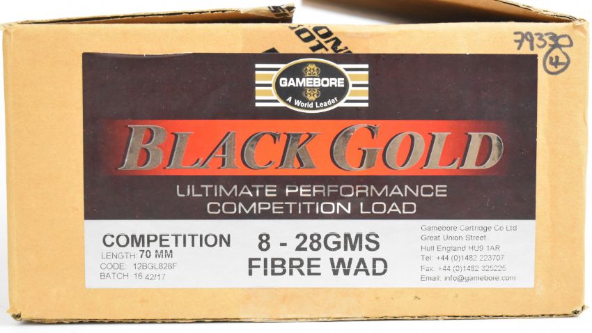Two hundred and fifty 12 bore Gamebore Black Gold 28g 8 shot shotgun cartridges, all in original boxes. PLEASE NOTE THAT A VALID RELEVANT SHOTGUN CERTIFICATE IS REQUIRED TO VIEW OR PURCHASE THIS LOT AND FOR ALL SHOTGUNS OR RIFLES PLEASE ENSURE YOU HAVE THE RELEVANT CERTIFICATE BEFORE BIDDING. We are not able to offer our usual postage service for this lot