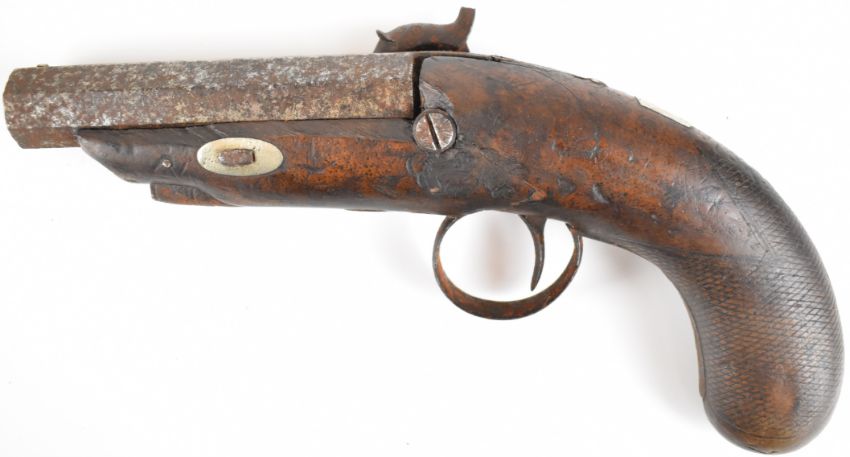 Fenton of London 36 bore percussion hammer action pocket or coat pistol with named and engraved lock, engraved stylised dolphin hammer, trigger guard and mounts, chequered grip, vacant wrist cartouche and 4 inch smooth bored octagonal barrel, overall length 22cm.
