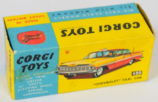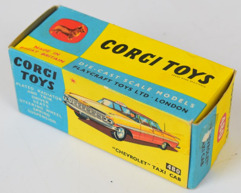 Corgi Toys diecast model Chevrolet Taxi Cab with yellow/red body, silver trim, aerial and rates decals on front doors, 480, in original box.