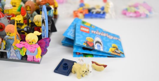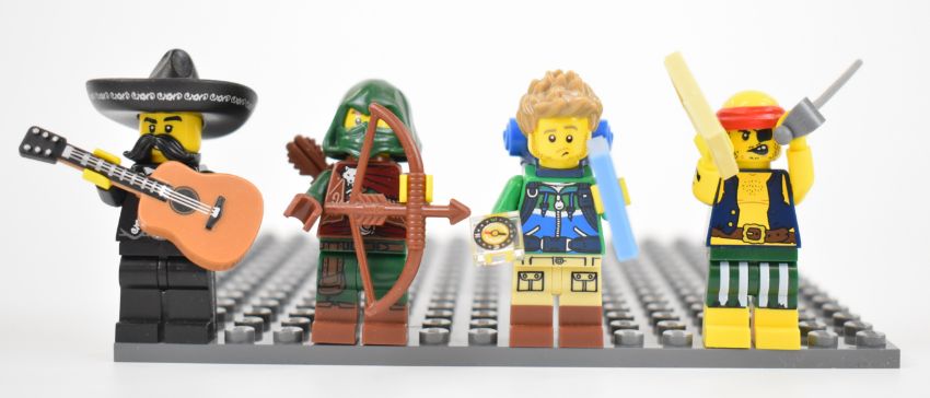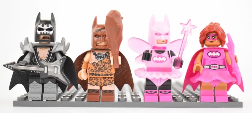 Sixty-four Lego minifigures and similar comprising sets 16, 17, The Batman Movie and UniKitty, all complete with accessories.
