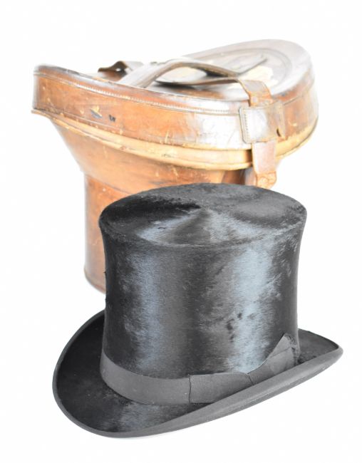 Silk top hat in leather case, Dunn and Jones, Kings Lynn size 6 7/8 or 22 1/8