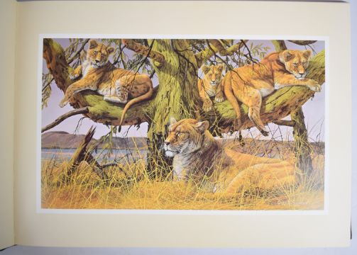 Gary R. Swanson World of Wildlife Paintings Reflections of Three Continents, 1986 deluxe signed edition limited to a total of 1,245 copies (copy 35 LE), this copy with original pen and ink sketch of tiger's head labelled 'remarque' signed and dated by the artist on half-title, illustrated with colour printed plates and black & white vignettes, oblong gilt folio hand-bound in full morocco with an original mounted bronze of horned ram inset on front cover [only 500 copies were remarqued copies]