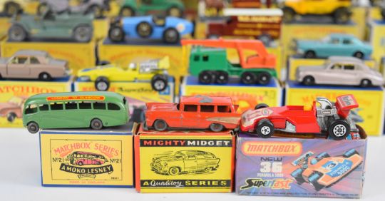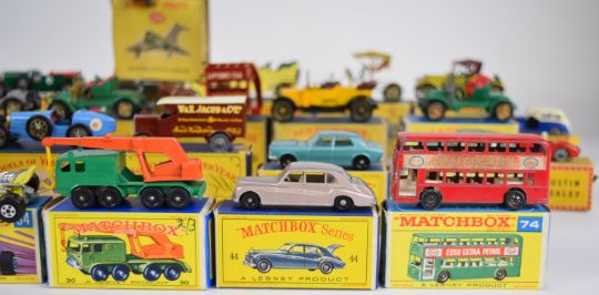 Forty-four Matchbox and similar diecast model cars from various series, all in original boxes.