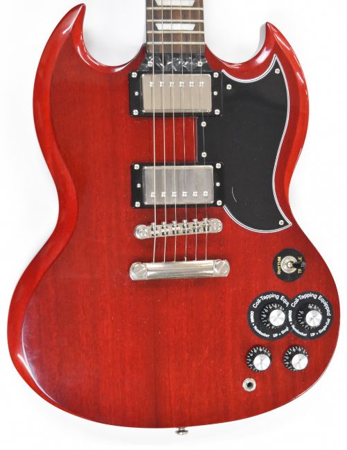 Epiphone SG Pro solid body electric guitar with humbucker pickups, rosewood fretboard and cherry red finish, 2014, serial 1410200139.
