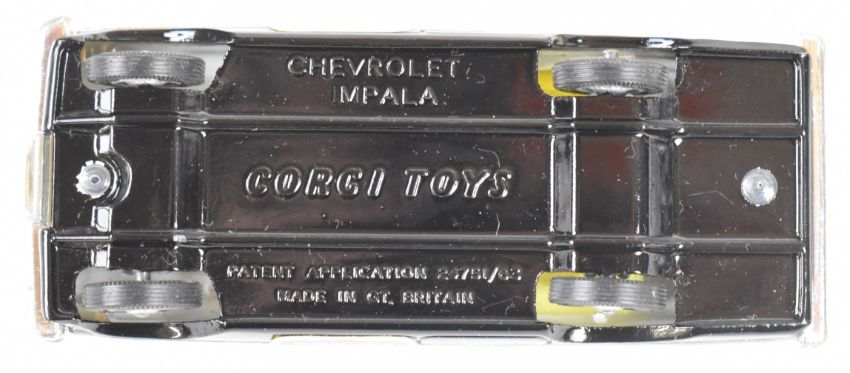 Corgi Toys diecast model Chevrolet Police Car with black and white body, silver trim, spring suspension, aerial and two figures, 481, in original box.