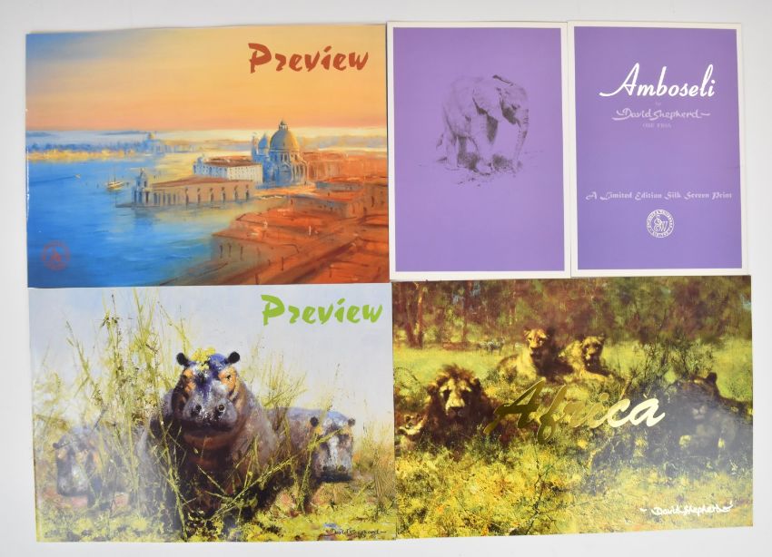 David Shepherd The Man & His Paintings with text by the artist 1991. Painting with David Shepherd his unique studio secrets revealed 2004 signed by the artist on half-title. David Shepherd My Painting Life 1995. An Artist in Conservation 1992. The Man Who Loves Giants by David Shepherd 1989, all in colour dust-wrappers with a collection of glossy colour prospectuses