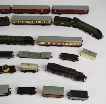 Hornby Dublo comprising two A4 Pacifics, Duchess, 4MT tank, five coaches and thirteen goods wagons.