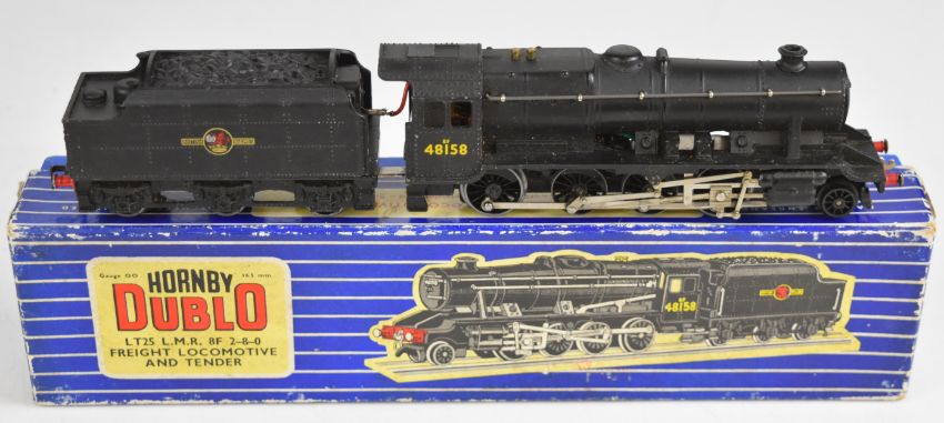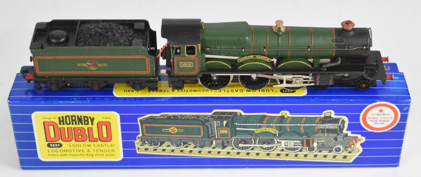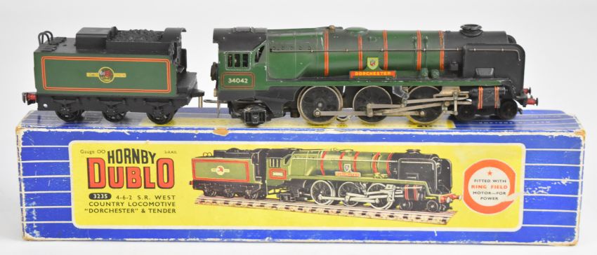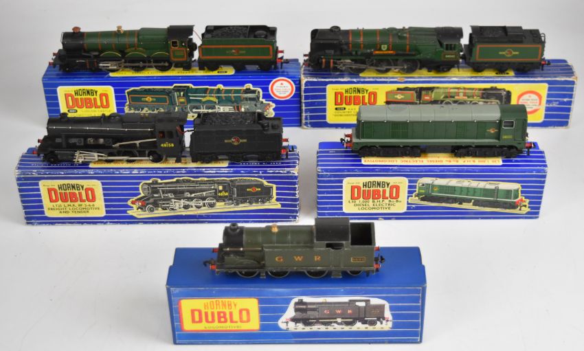 Five Hornby Dublo 00 gauge model railway locomotives comprising 'Ludlow Castle', BHP Bo-Bo Diesel, West Country 'Dorchester', LMR Freight, and GWR N2 Tank, in original and reproduction boxes.