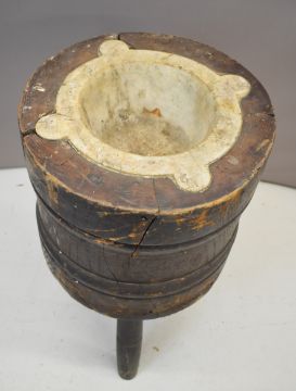 19thC apothecary / shopfitting / haberdashery marble mortar (no pestle) inset into a large turned wood stand raised on three tapering turned legs, diameter 46 cm x height 86cm