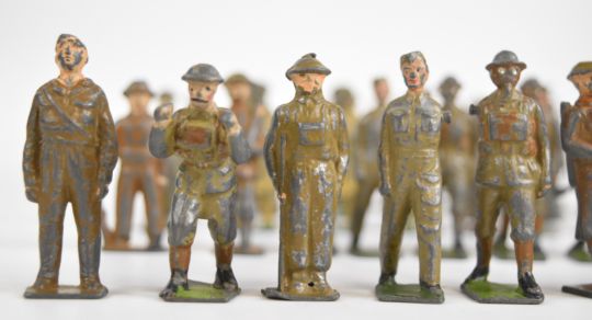Sixty-nine Britains painted metal soldiers comprising British Infantry and a kilted regiment.