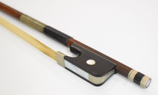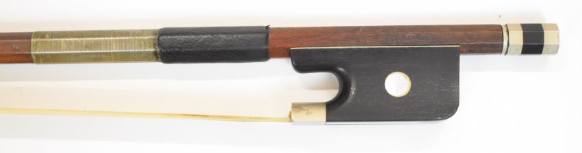 Steffen Kuhnla Pernambuco cello bow with faux ivory tip, ebony frog and mother of pearl inlay, made in Germany, length 72cm, weight 80g