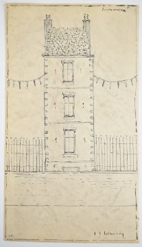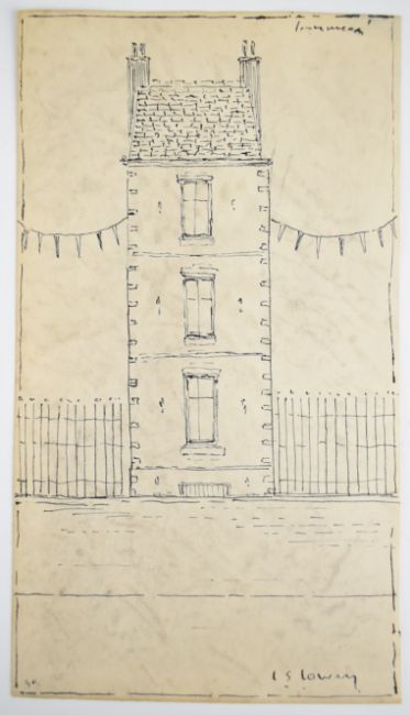 Manner of Laurence Stephen Lowry (1887 - 1976) lone house flanked by bunting and railings, bearing signature L S Lowry lower right and inscribed verso, 21.5 x 12cm