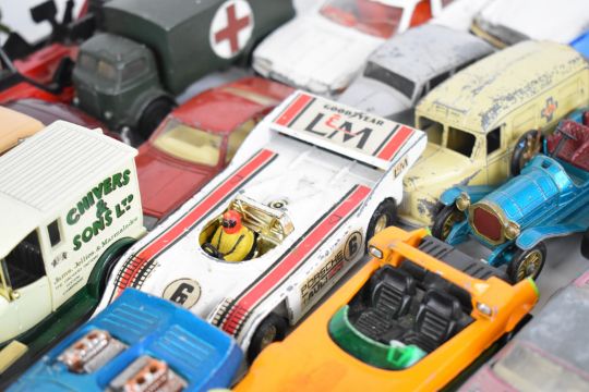 Over one hundred vintage Corgi, Dinky and Matchbox diecast model cars to include Triumph, Studebaker, Maserati, Ferrari Formula 1, Riley Path Finder and Morris 1100.