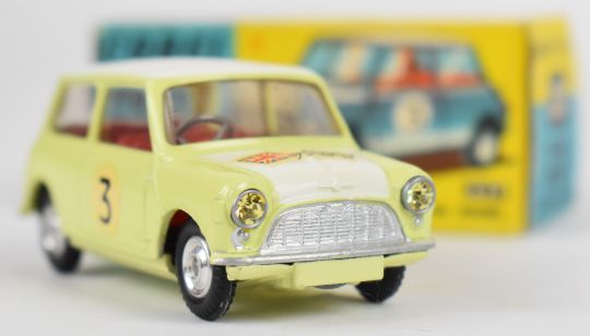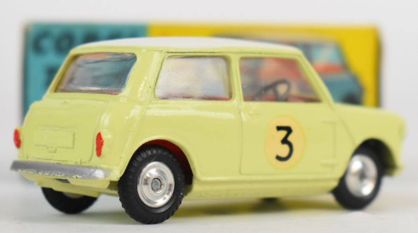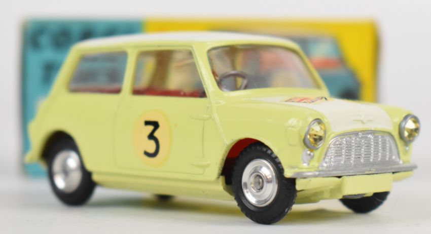 Corgi Toys diecast model Morris Mini-Cooper Competition Model with yellow/cream body, red interior, silver hubs, No.3 decals and jewelled headlights, 227, in original box.