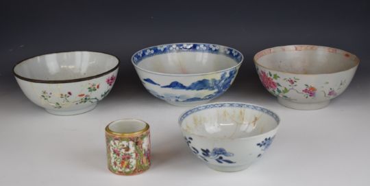 Chinese bowls and Canton cache pot all partly restored, largest diameter 27cm