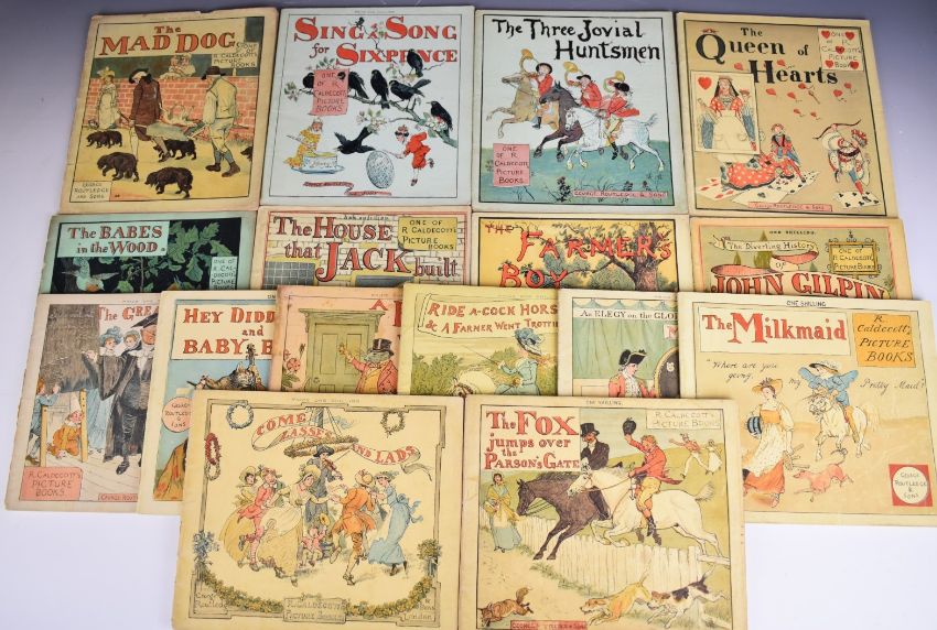 Randolph Caldecott complete collection of first edition picture books, illustrated in colour by Caldecott and published by George Routledge (1870s-1880s) comprising John Gilpin, The Farmer’s Boy, Queen of Hearts, Song of Sixpence, Three Jovial Huntsmen, Babes In The Wood, House That Jack Built, Mad Dog, Hey Diddle Diddle & Baby Bunting, Fox jumps over the Parson’s Gate, The Milkmaid, Mrs. Mary Blaize, Ride A-Cock Horse and A Farmer Went Trotting Upon His Grey Mare, A Frog he would a-Wooing go, Great Panjandrum, Come Lasses and Lads, all bound in publisher's colour illustrated glossy card covers (16)  More commonly found with the later Frederick Warne publisher's details