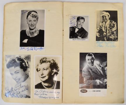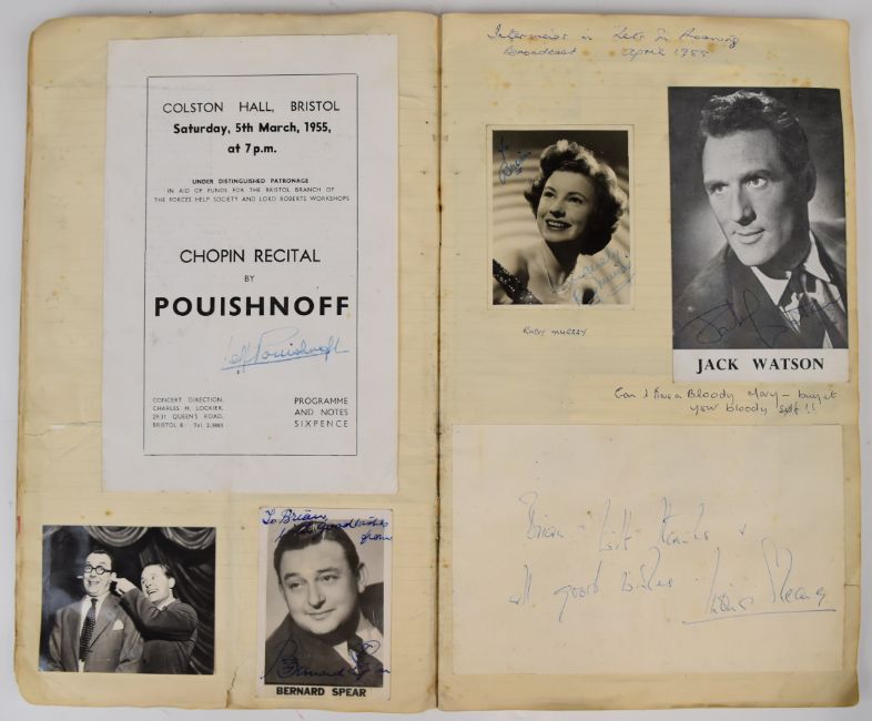 Autograph collection of British actors, entertainers and artists to include Richard Attenborough, Benny Hill, Eric Morecambe, Ernie Wise, June Whitfield, Max Miller, Sir Peter Scott (with sketch), Bruce Bairnsfather (with sketch), Terry Thomas, Chic Murray, Jack Watson, Peter Brough and Archie Andrews. Collected by the vendor's father who was a radio broadcaster throughout the 1950s