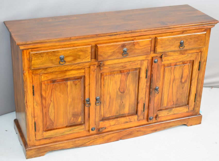 Contemporary hardwood sideboard with metal mounts, three drawers and cupboards, W150 x D45 x H90cm