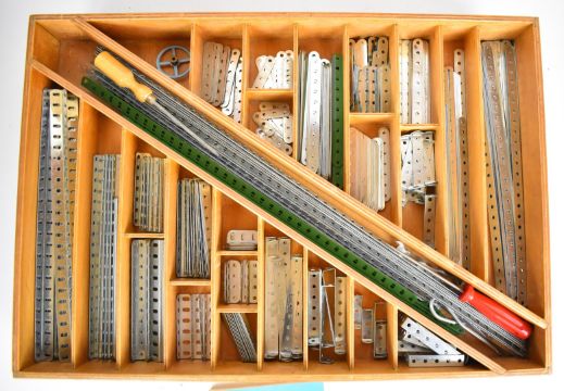 Meccano Outfit Number 10 in yellow/blue, with multiple spares and instruction booklets, housed in a four tier stacking wooden box.