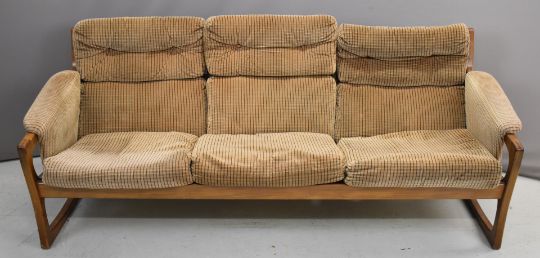 Mid century modern teak Scandi / G Plan sofa, armchair and rocking chair, largest W177 x D82 x H72cm